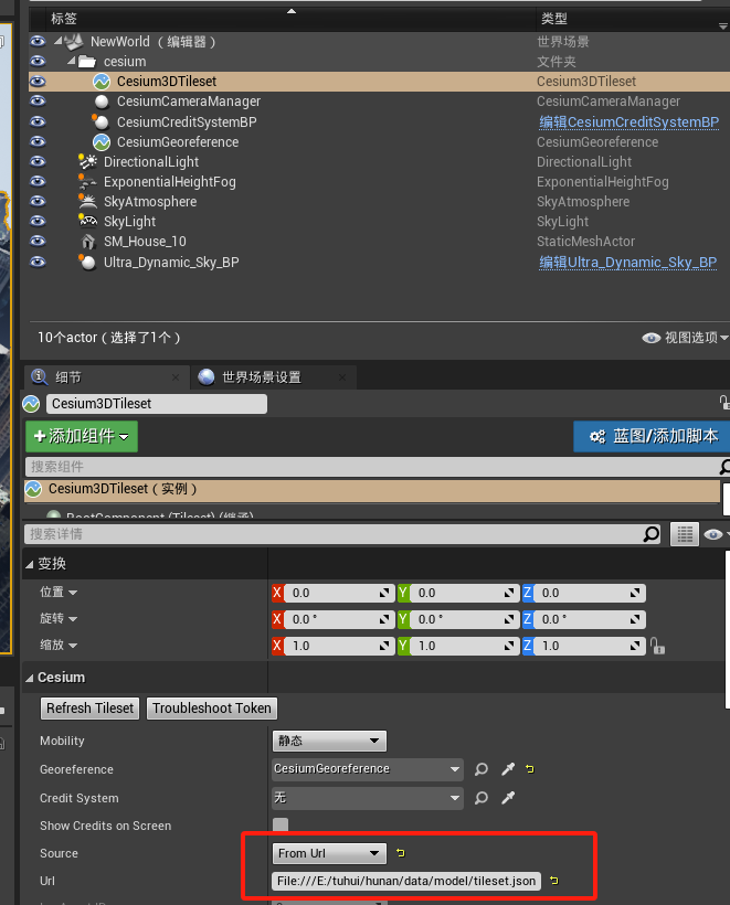 (5.在世界大纲视图中选中Cesium3DTileset,将Cesium中的Mobility修改为可移动。)