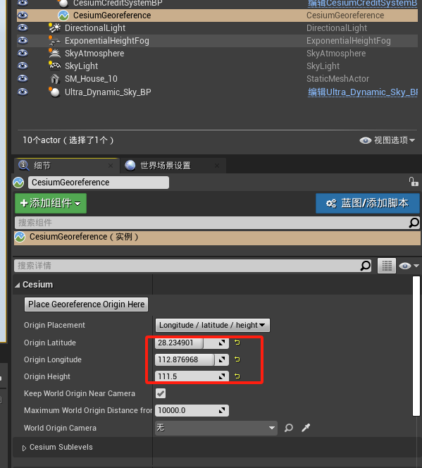 CesiumGeoreference设置为:28.235238, 112.877178, 0
