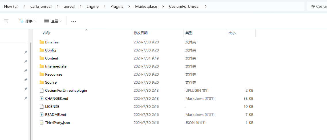 1.下载并解压 Cesium for Unreal 插件 到CarlaUE引擎的plugins/Marketplace文件夹下: