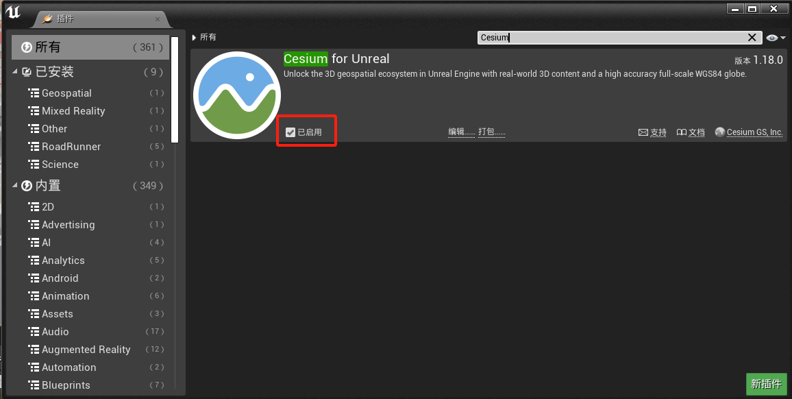 2.导入插件:roadrunner插件(包括RoadRunnerCarlaContent、RoadRunnerCarlaDatasmith、RoadRunnerCarlaIntegration、RoadRunnerDatasmith、RoadRunnerImporter、RoadRunnerMaterials、RoadRunnerRuntime)、Cesium插件;