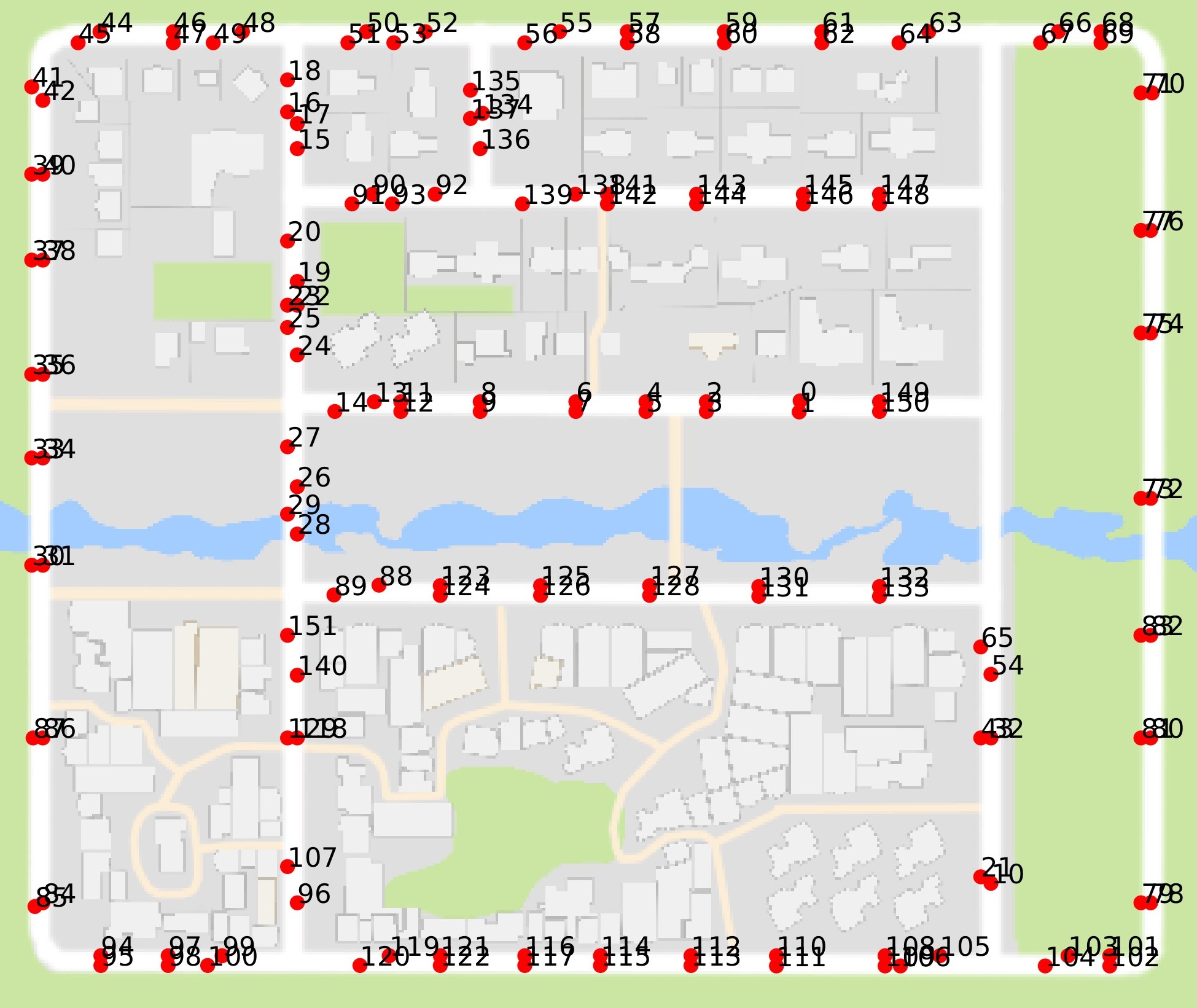 实验由一组姿势定义的任务组成。让我们从选择其中一个城市的姿势开始,以 Town01 为例。首先,我们需要查看所有可能的位置,为此,在终端中运行 CARLA 模拟器,运行 view_start_positions.py :