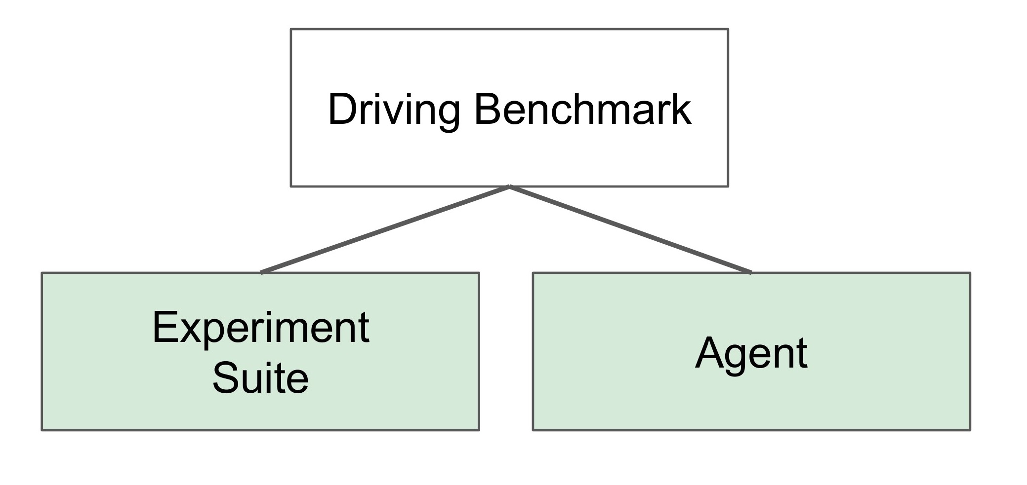 驾驶基准测试与其他两个模块相关联。代理模块是另一个模块(实验套件)中执行的控制器。这两个模块都是抽象类,必须由用户重新定义。