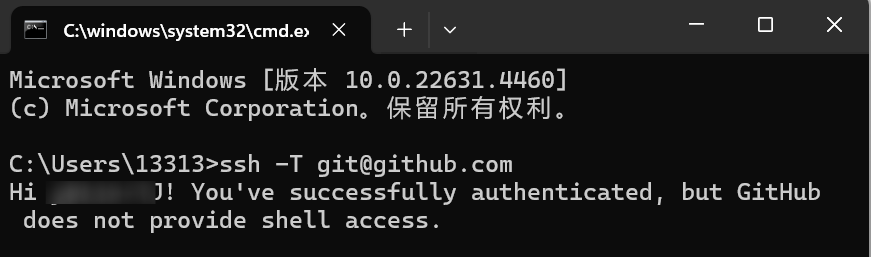 ssh -T git@github.com命令测试 SSH 是否成功连接 GitHub: 若第一次使用,需手动输入yes并按 Enter 回车确定。出现如下图所示提示即表示连接成功。