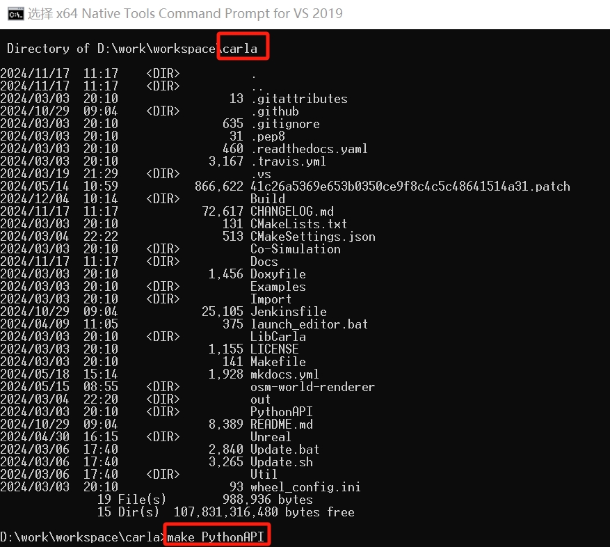 如果想重新编译LibCarla或者使用从其他地方拷贝过来的Build目录下的文件,需要删除Build/libcarla-visualstudio目录,然后重新运行编译命令(否则PythonAPI\carla\dependencies目录不会生成,生成.whl文件时遍历的不到依赖库,报错:NotADirectoryError: [WinError 267] 目录名称无效。: 'dependencies/lib'):