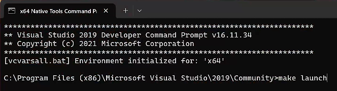 call "C:\Program Files (x86)\Microsoft Visual Studio\2019\Community\VC\Auxiliary\Build\vcvars64.bat"