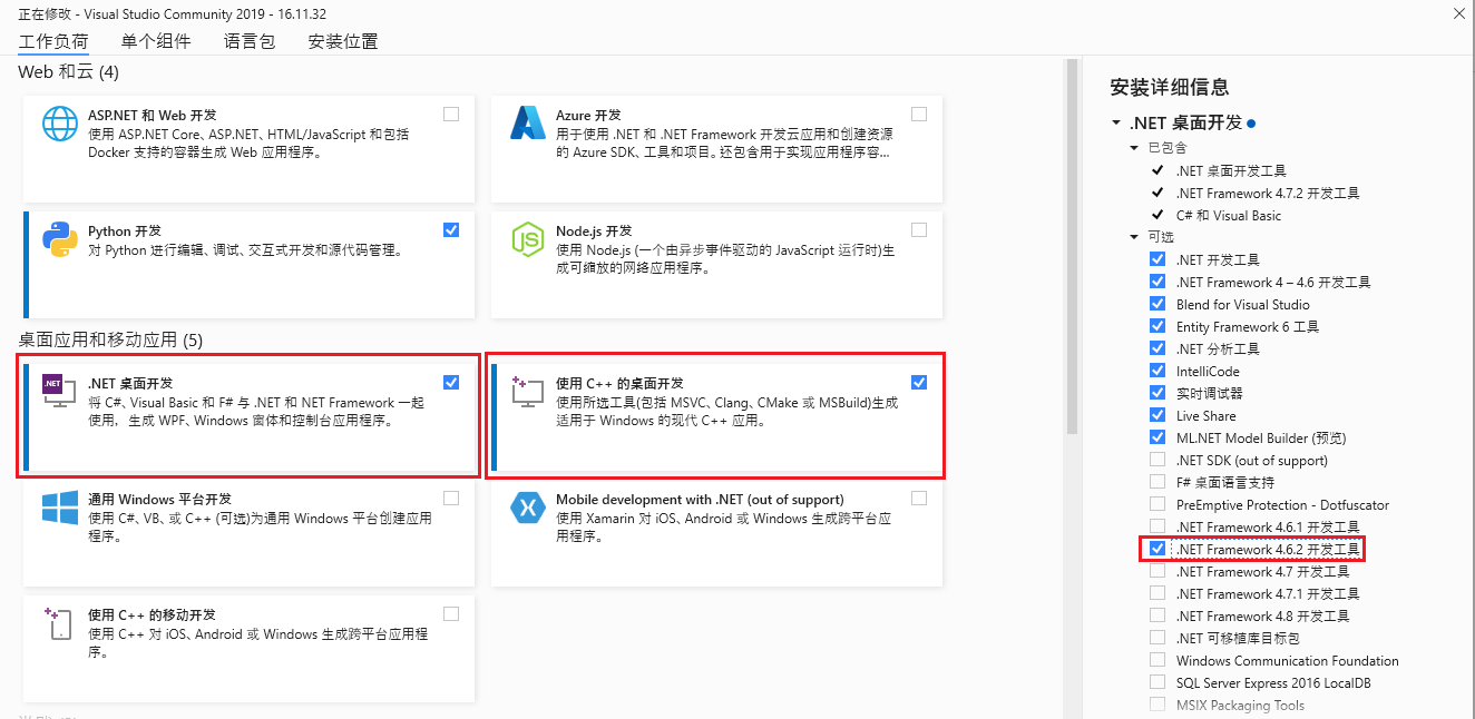 - .NET framework 4.6.2. 在 Workloads 部分中,选择 .NET 桌面开发 ,然后在右侧的安装详细信息面板中选择