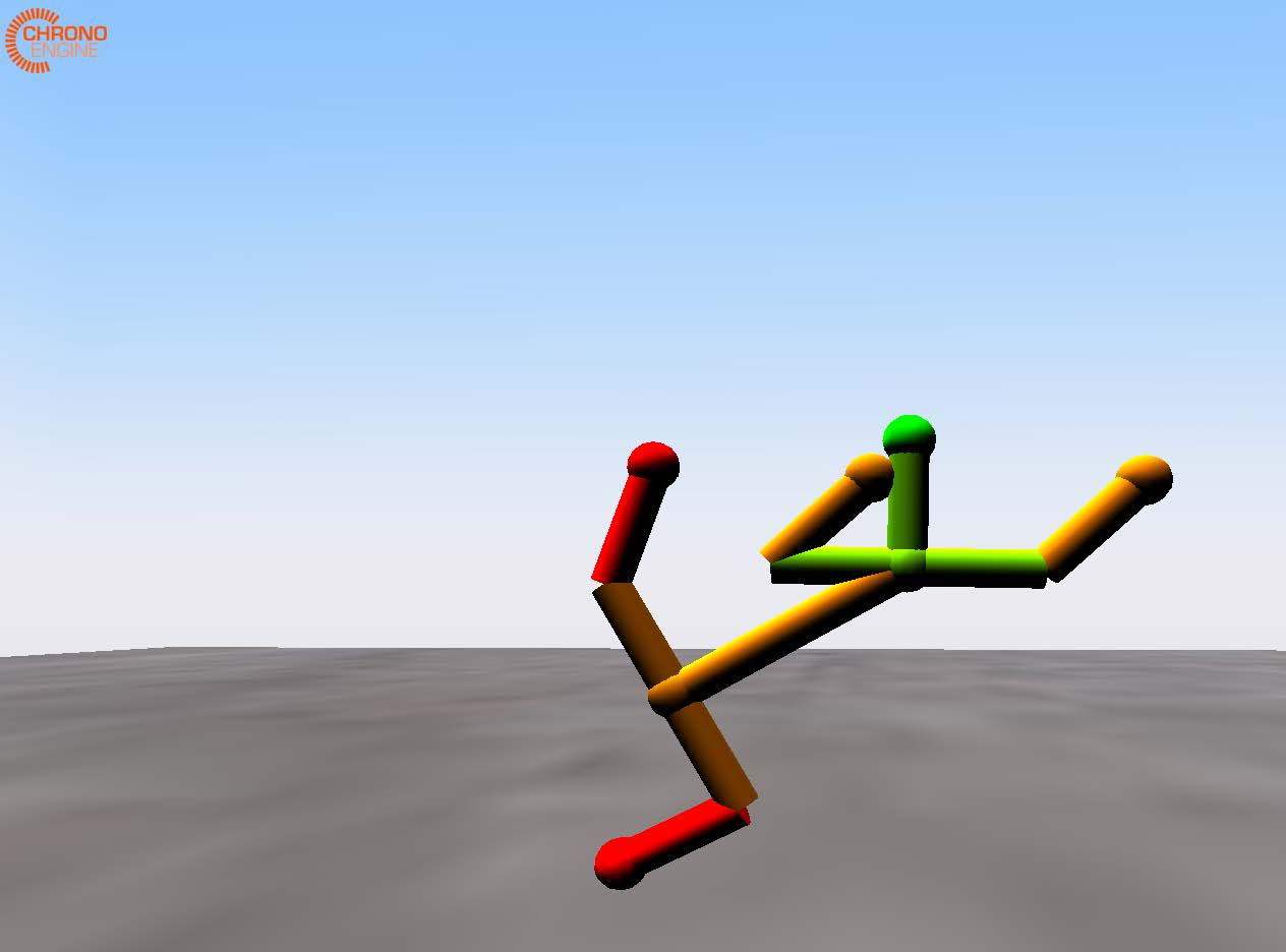 primitives 使用 Chrono 的基本可视化资源,为每个身体创建一个可视化模型。该模型由一个以身体参考系原点为中心的球体和连接身体参考系与所有相邻关节位置(内侧关节和所有外侧关节)的圆柱体组成。参见下图中的示例。