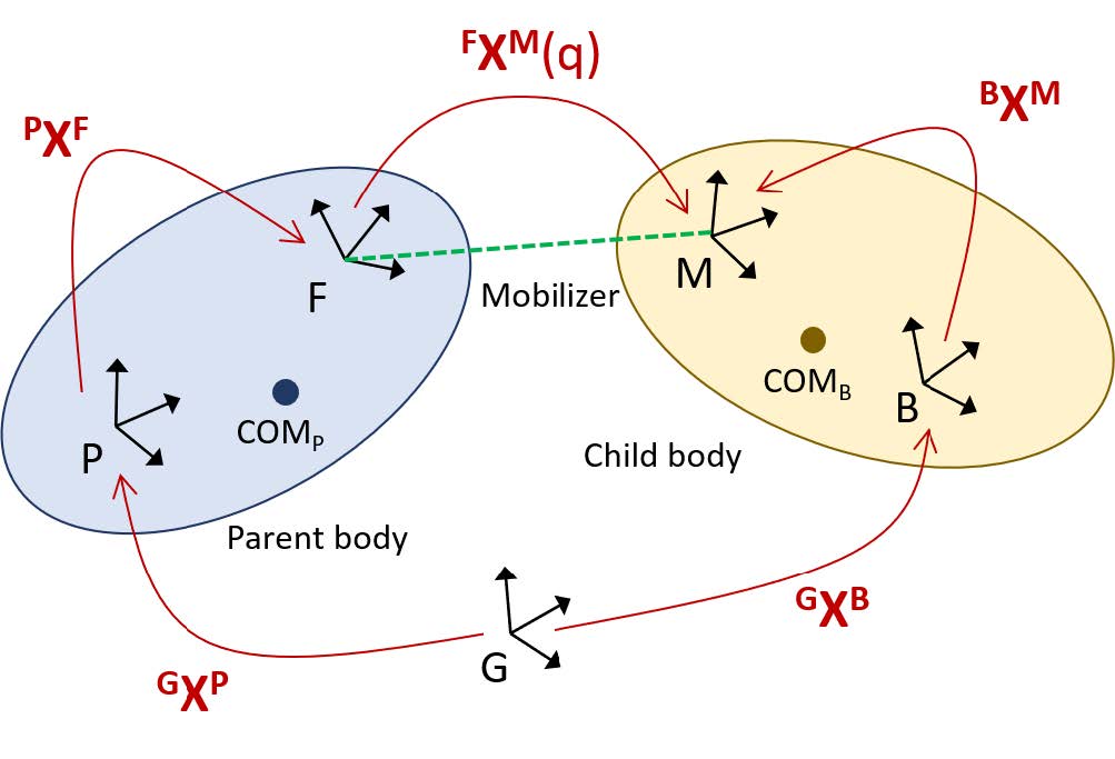 其中, 是父体的绝对变换, 表示父体外侧关节的位置(在 坐标系中表示), 是动子体的变换(在机械关节的固定坐标系和运动坐标系之间,由特定动子体的内部坐标参数化), 是子体上 -1 内侧关节的位置(在 坐标系中表示)。注意, 。