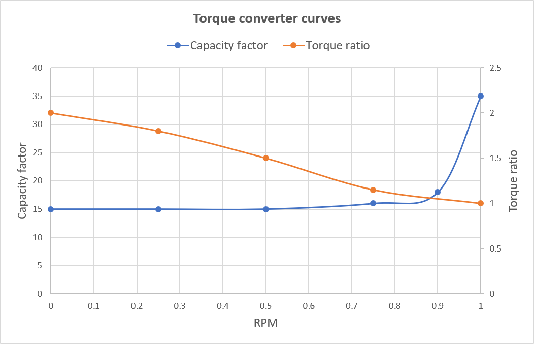 - 扭矩转换器 ( ChShaftsTorqueConverter ),通过曲线指定容量系数作为速度比的函数,以及扭矩比作为速度比的函数