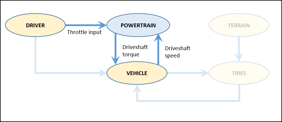 动力传动系统连接到驱动系统(接收油门输入)和车辆系统的传动系子系统(接收驱动轴角速度并发送驱动轴扭矩)。