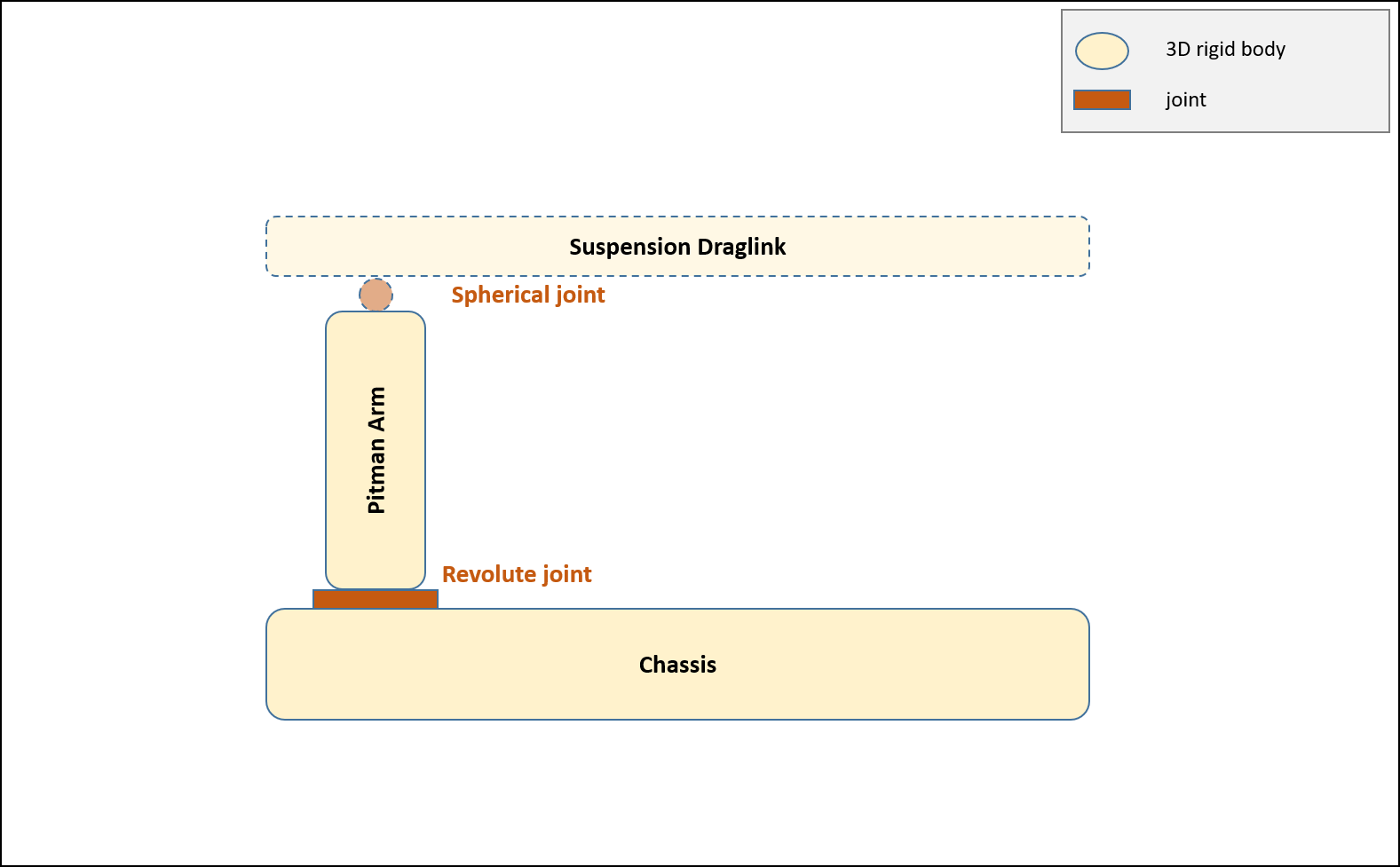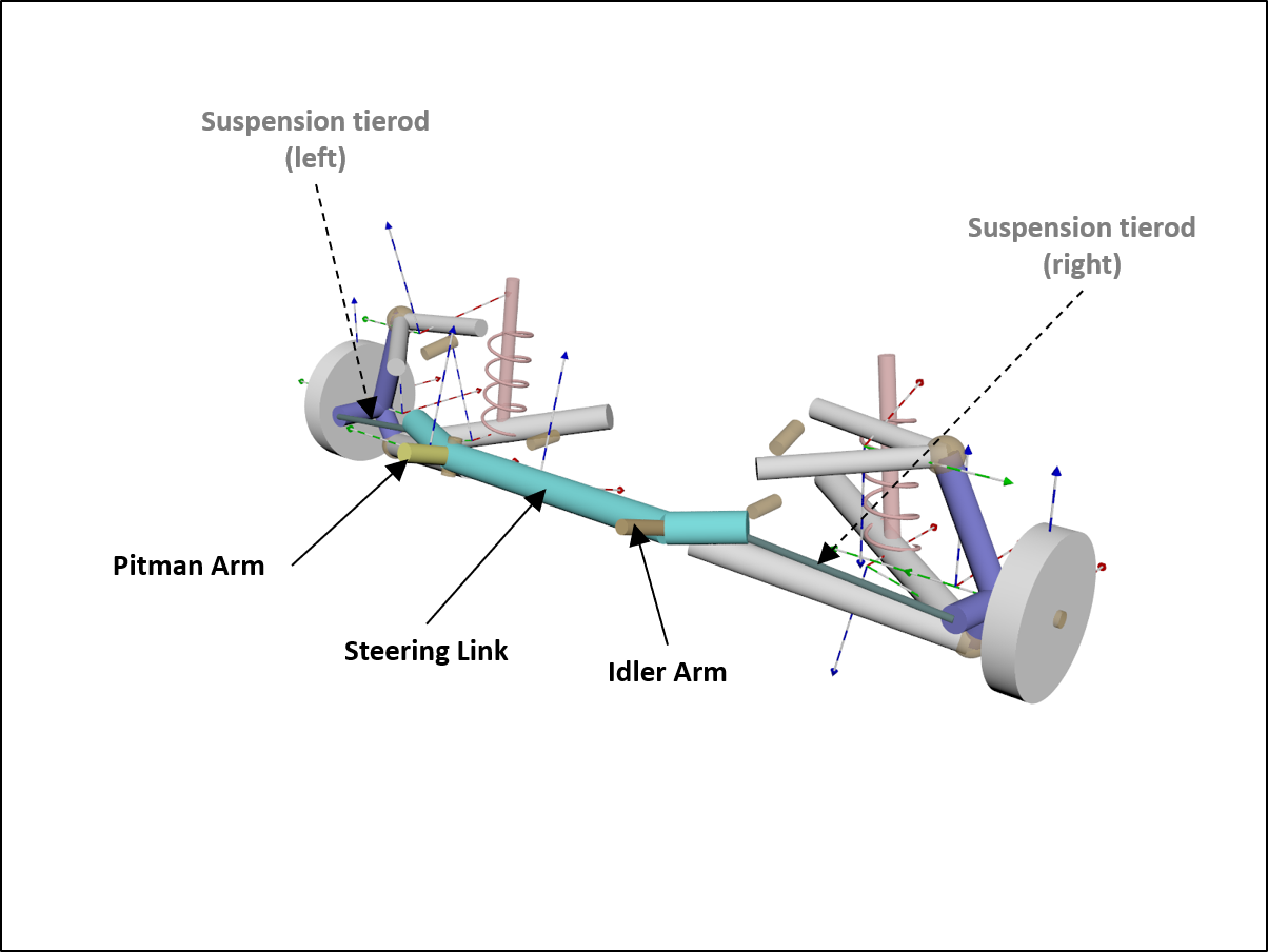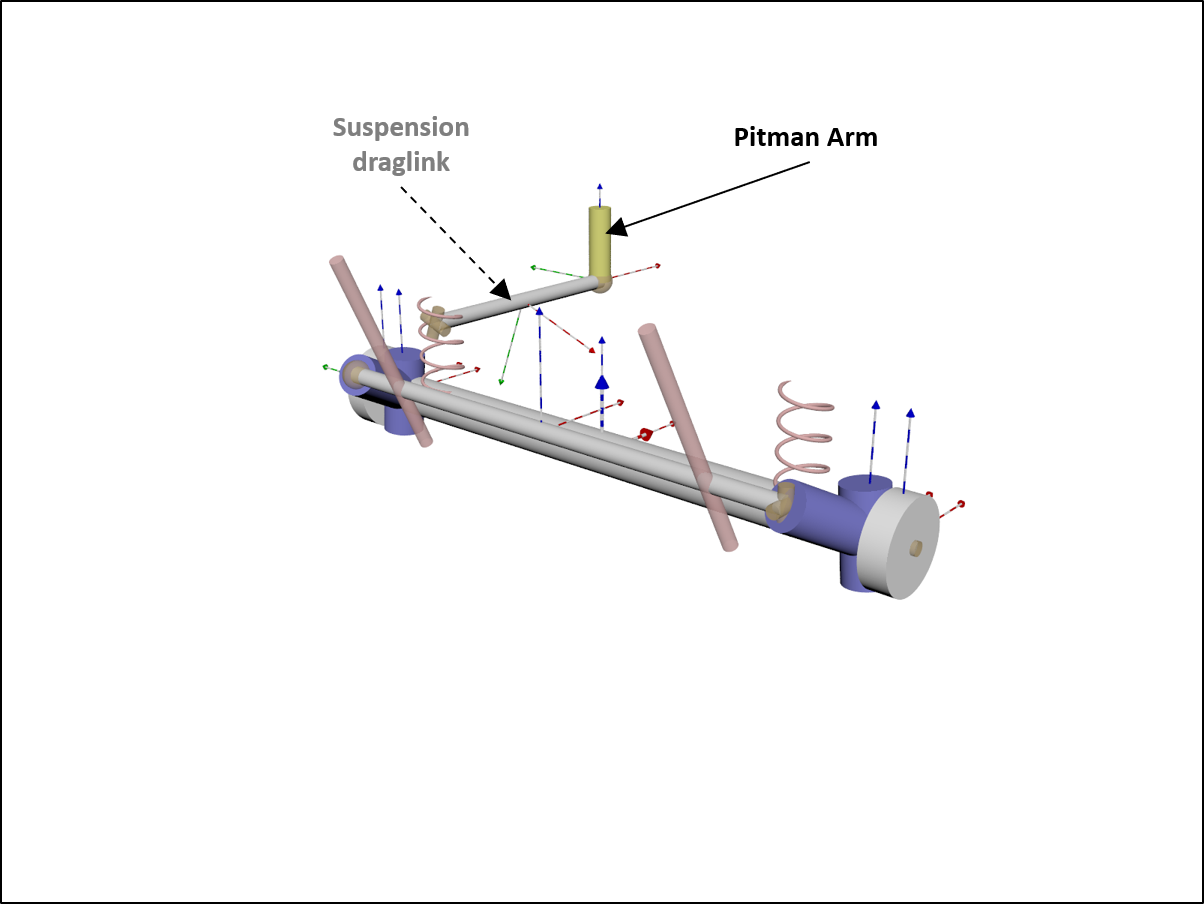 该转向机构为四连杆机构,转向连杆体通过转向臂和惰臂与底盘相连。转向臂体通过万向节与转向连杆相连,通过旋转关节与底盘相连。驾驶员转向输入用于控制旋转关节的角度。在 Chrono::Vehicle 转向臂模板中,惰臂采用复合旋转球关节建模。