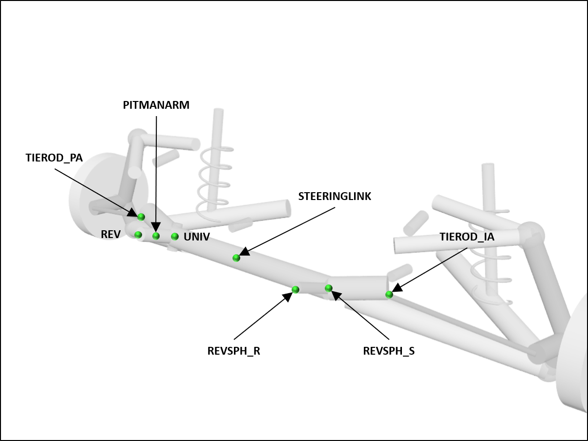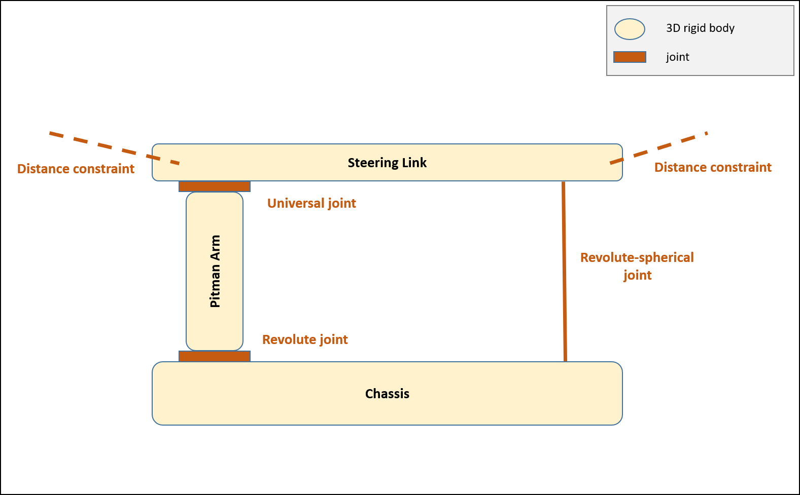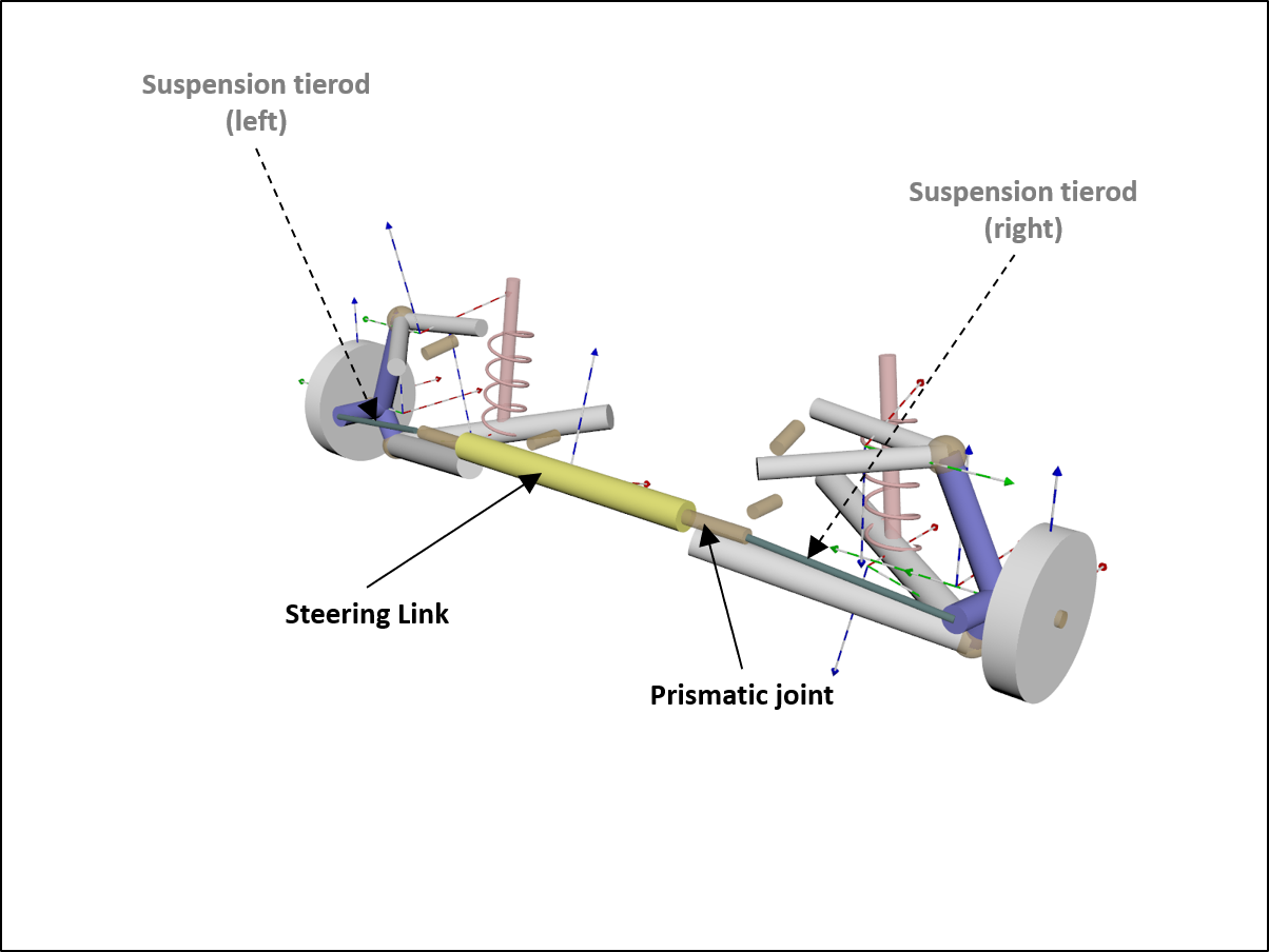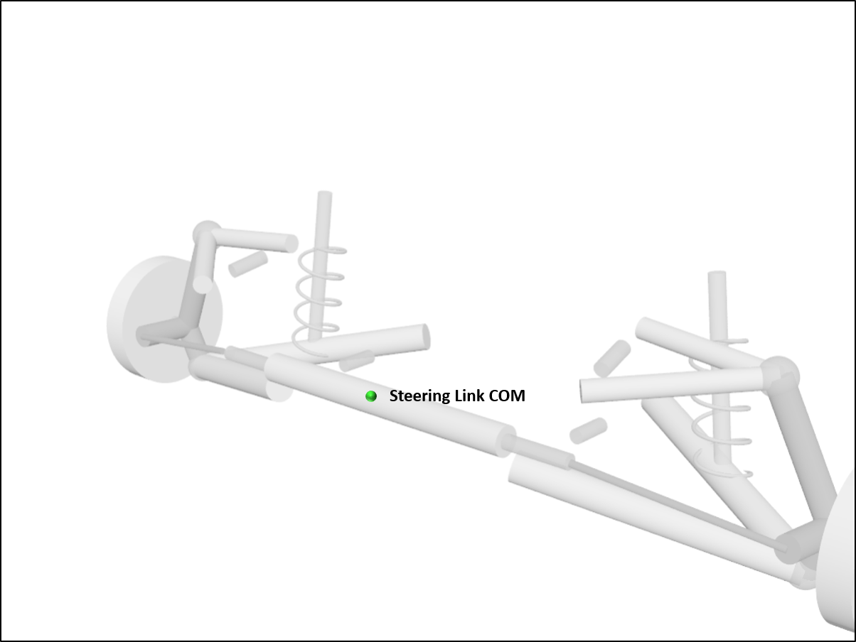 该转向机构为四连杆机构,转向连杆体通过转向臂和惰臂与底盘相连。转向臂体通过万向节与转向连杆相连,通过旋转关节与底盘相连。驾驶员转向输入用于控制旋转关节的角度。在 Chrono::Vehicle 转向臂模板中,惰臂采用复合旋转球关节建模。