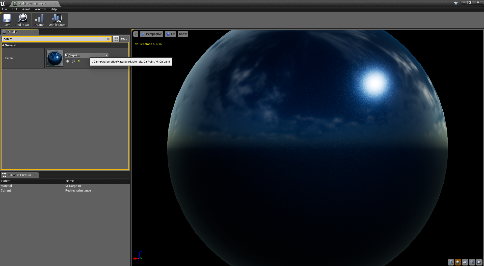 在“详细信息”窗格下,搜索“父”材料,并用“M_Carpaint”材料替换“DummyCar”材料。