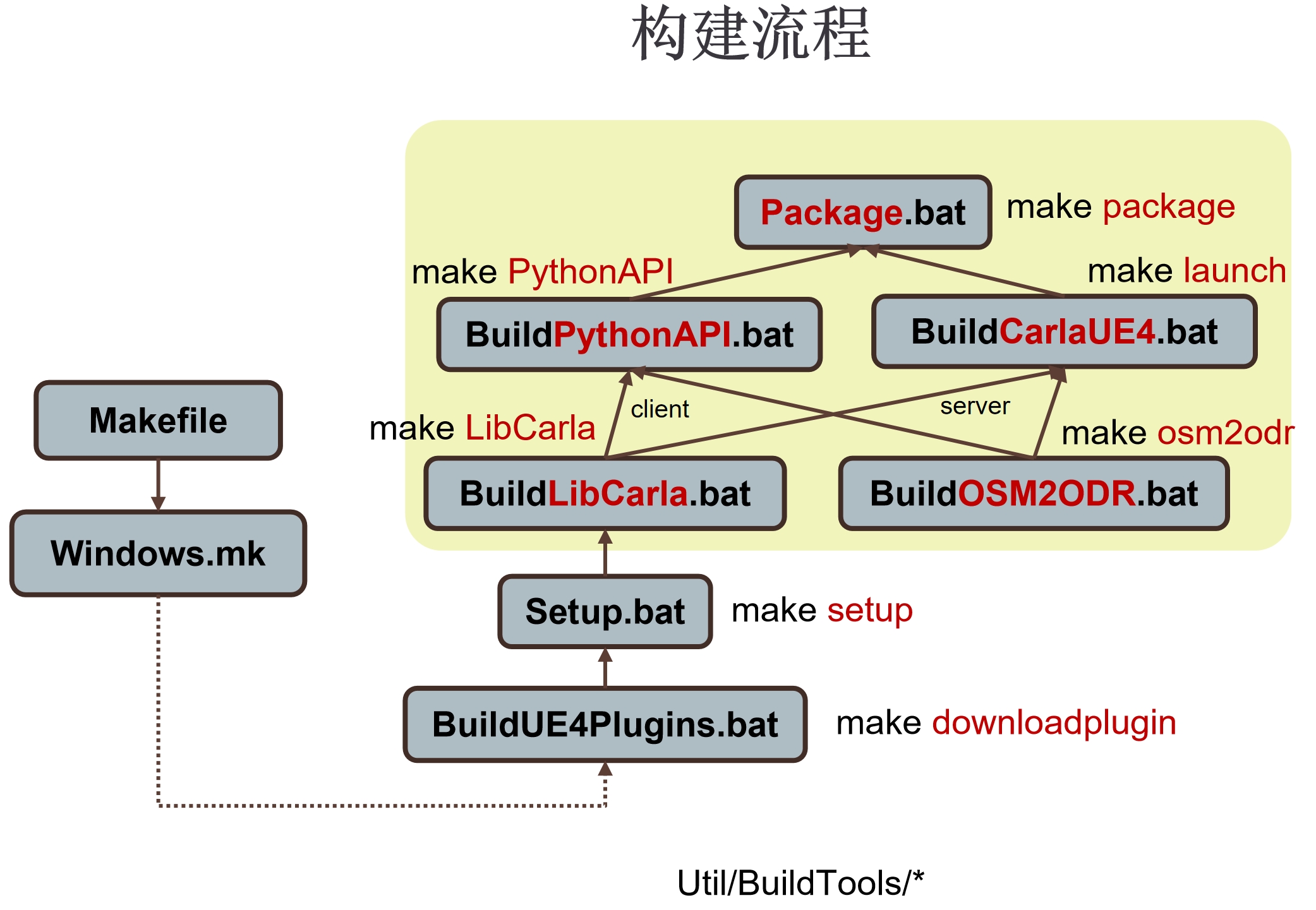 Makefile,调用Util/BuildTools/Windows.mk,真正执行的是BuildLibCarla.bat,构建LibCarla的服务端和客户端;