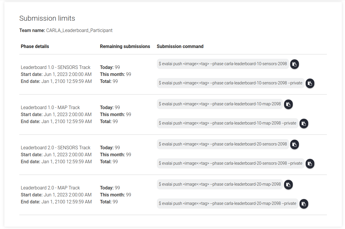 转至“所有挑战”部分并找到 Carla 排行榜挑战,或使用 Carla AD Challenge 2.0 链接 。选择“参与”,然后选择一个参与团队来申请挑战。您需要等待 Carla 排行榜管理员验证您的团队。一旦您的团队通过验证,您就可以开始提交。