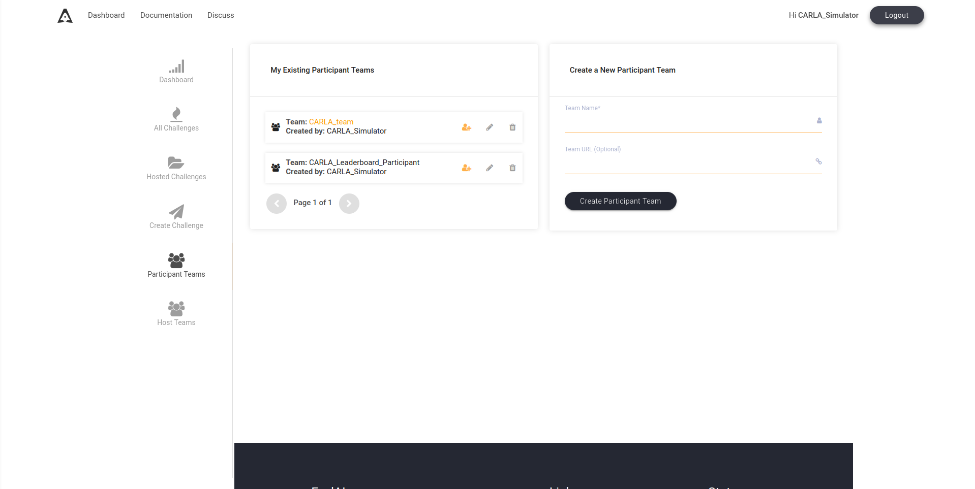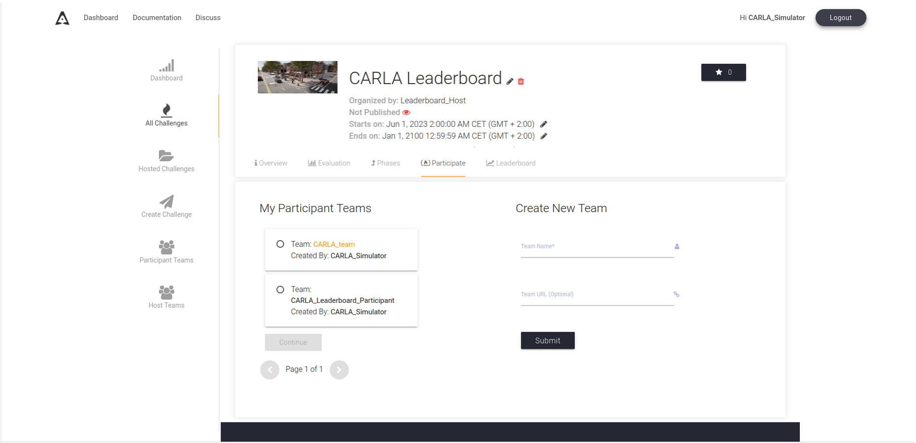 转至“所有挑战”部分并找到 Carla 排行榜挑战,或使用 Carla AD Challenge 2.0 链接 。选择“参与”,然后选择一个参与团队来申请挑战。您需要等待 Carla 排行榜管理员验证您的团队。一旦您的团队通过验证,您就可以开始提交。