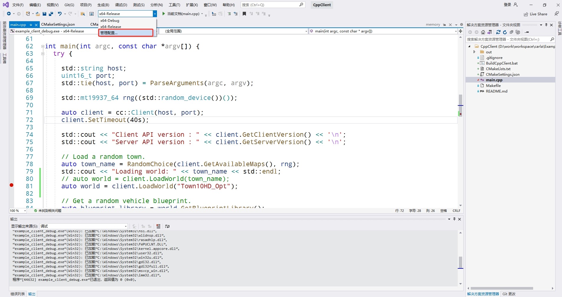 管理配置,添加新的配置x64-release;(注意:x64-Debug还有问题); - 启动Carla服务端后,在vs2019中点击