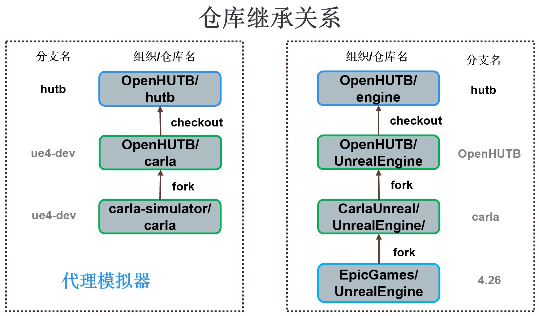 开源湖工商项目继承并同步自Carla社区,并增加许多自定义的特性,比如 虚拟现实 鱼眼相机 等。下图为仓库和分支之间的继承关系: