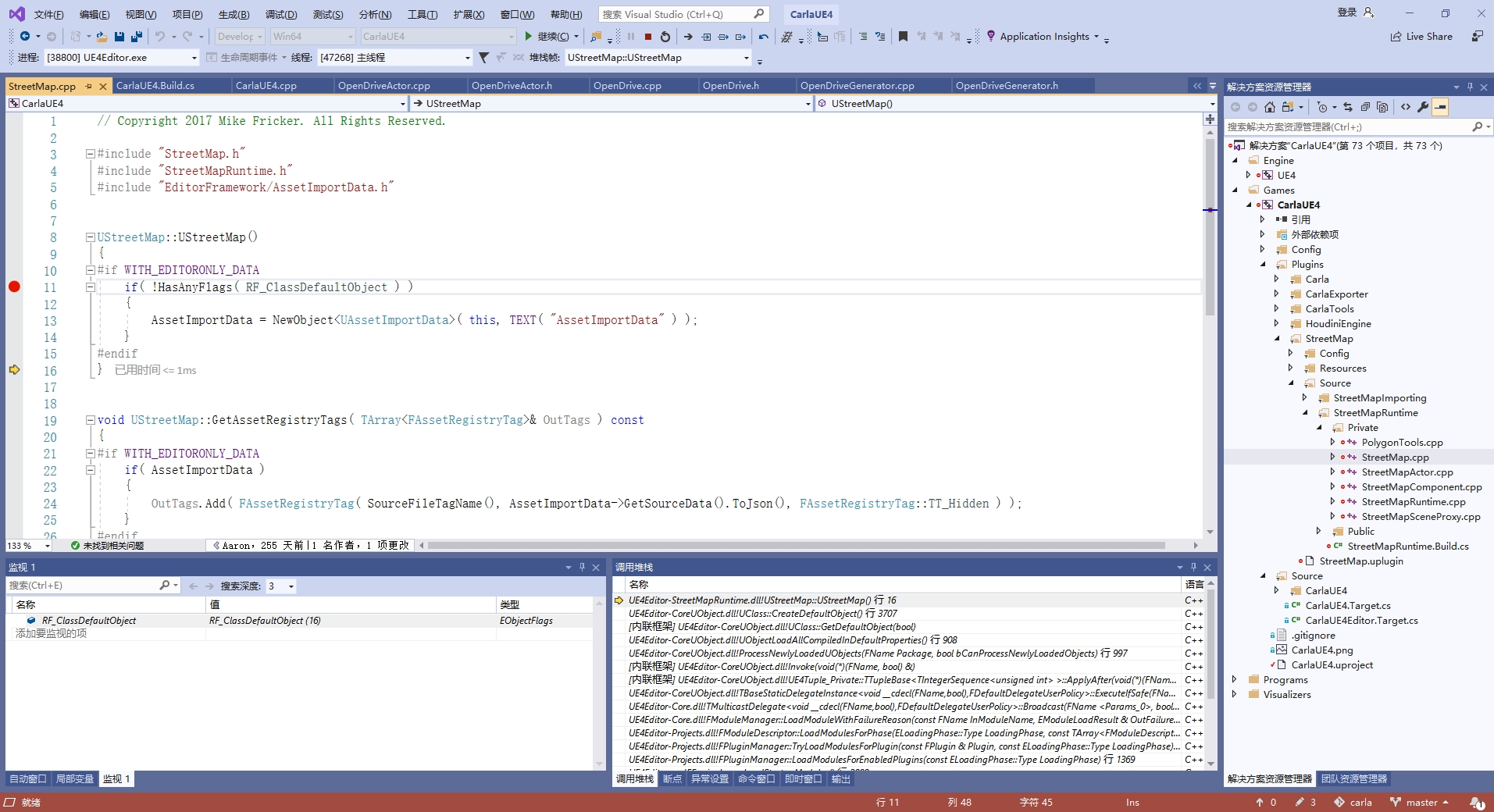 解决方案中展开Games->CarlaUE4,在想要查看的源代码行的最左侧单击增加断点(比如:CarlaUE4->Plugins->CarlaTools->Source->CarlaTools->Private的OpenDriveToMap.cpp的GenerateTileStandalone()),在菜单运行调试(D)->开始调试(S),程序将在断点出暂停。通过调式(D)->窗口(W)->监视(W)->监视 1打开变量监视窗口,查看变量值是否异常。