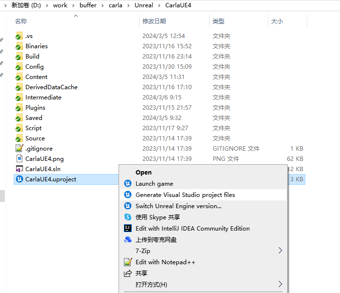 carla/Unreal/CarlaUE4/,右键文件CarlaUE4.uproject,选择运行Generate Visual Studio project files,在当前目录中将会生成VS的工程文件,双击打开CarlaUE4.sln。