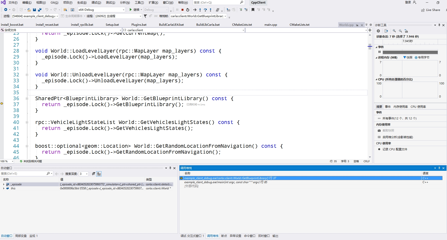 4.使用VS2019打开Examples/CppClient/CMakeLists.txt,程序在断点停止后按F10运行下一步,按F11进入LibCarla中的函数实现。