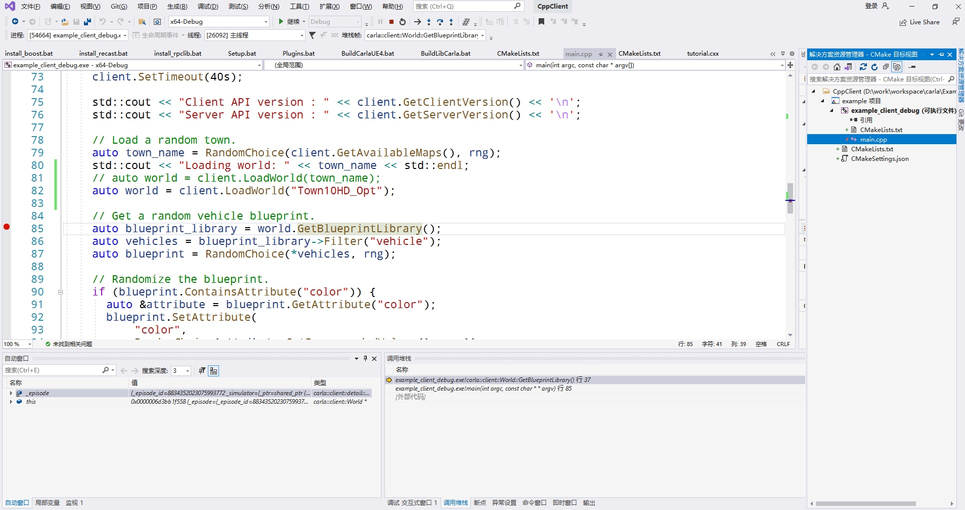 4.使用VS2019打开Examples/CppClient/CMakeLists.txt,程序在断点停止后按F10运行下一步,按F11进入LibCarla中的函数实现。